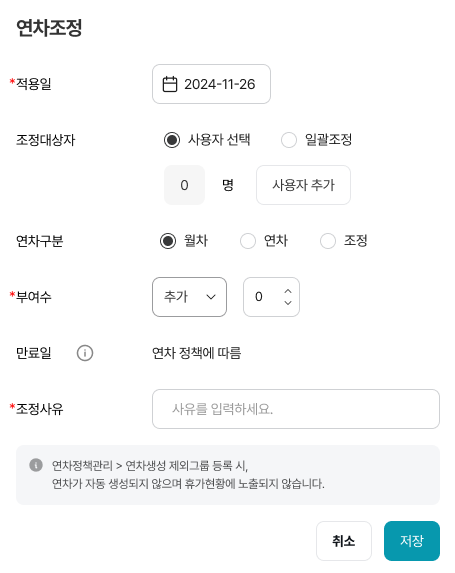 - 조정 추가 시 [조정 연차]로 합산 또는 차