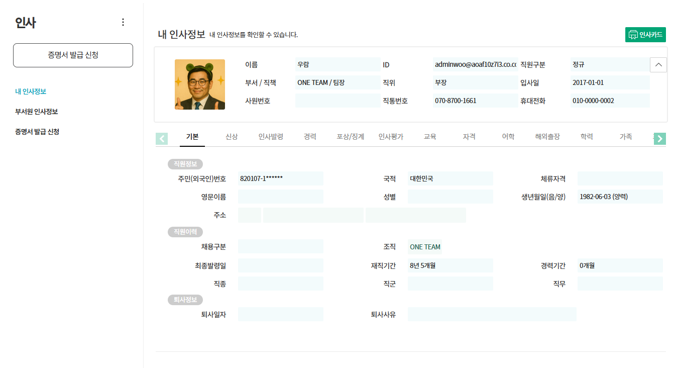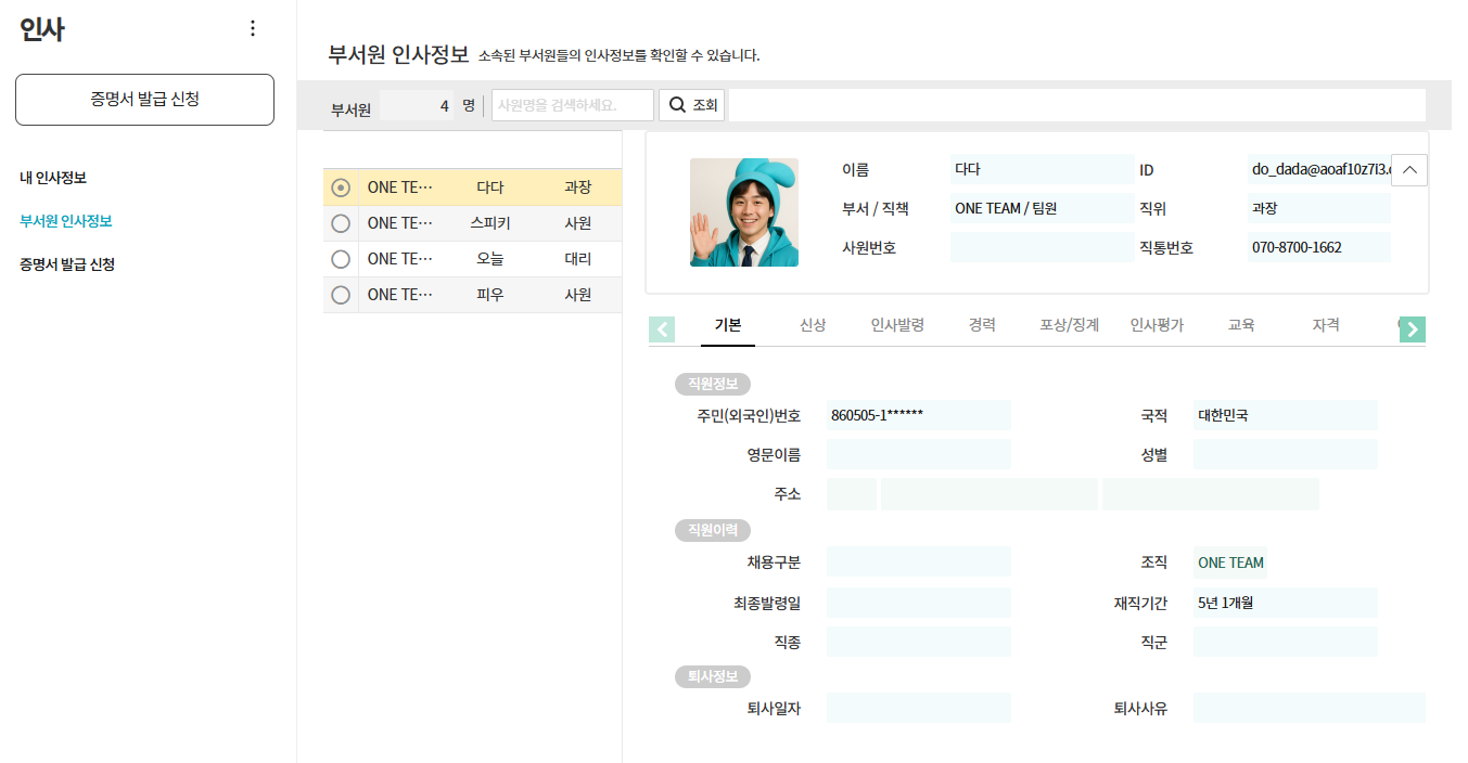 • 관리자 설정에 따라 (부)부서장일 경우, 소속 부서원의 인사 정보도 확인할 수 있습니다.