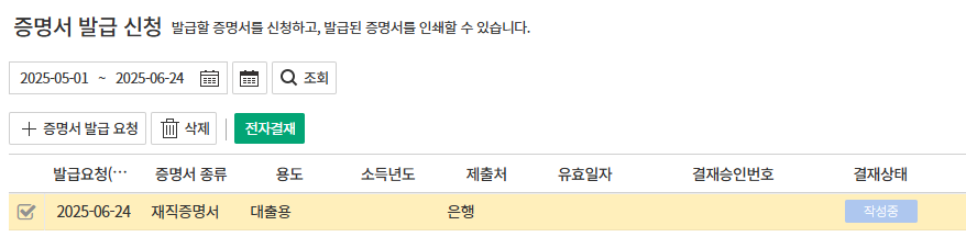 3. [저장] 클릭 시, 발급 신청 목록에 "작성중" 상태로 저장