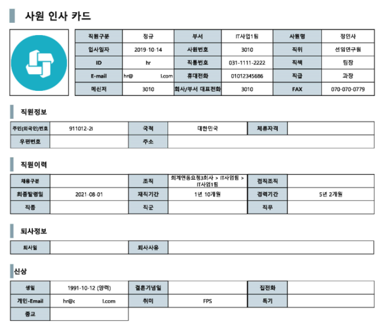 3. 인사카드 인쇄 : 보여지고 있는 인사정보를 양식에 따라 인쇄