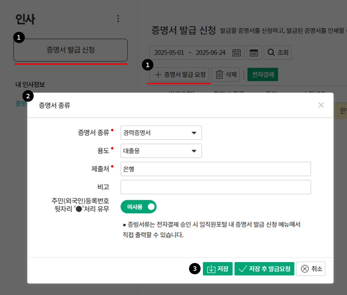 • 재직증명서, 경력증명서 등의 발급을 신청할 수 있습니다.