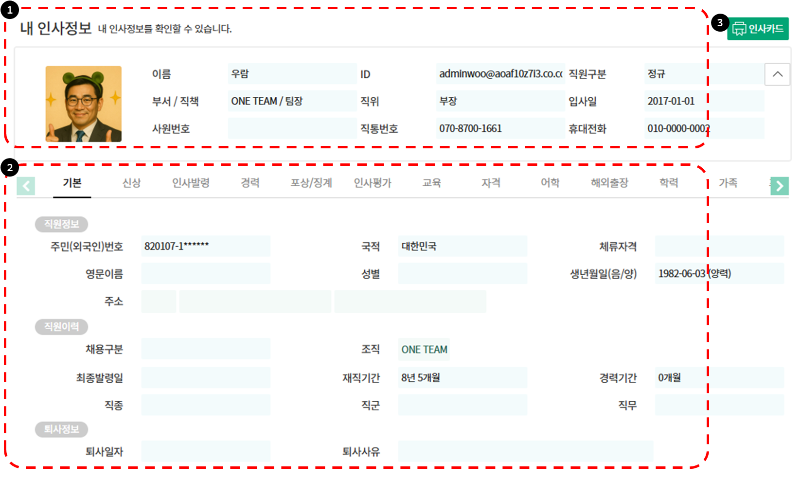 • 기본적인 프로필 정보 및 경력, 인사발령 내역, 교육 수강 내역 등 각종 인사정보를 확인할 수 있습니다.