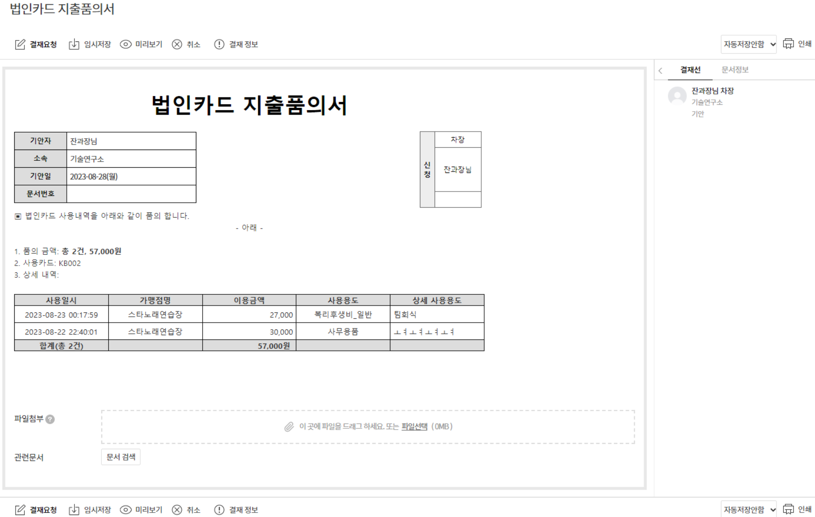 [저장 후 결재요청] : 입력한 내용을 저장하고 바로 법인카드 지출품의서 전자결재 창을 호출 - 결재문서 확인 후 [결재요청] 클릭하여 문서 상신