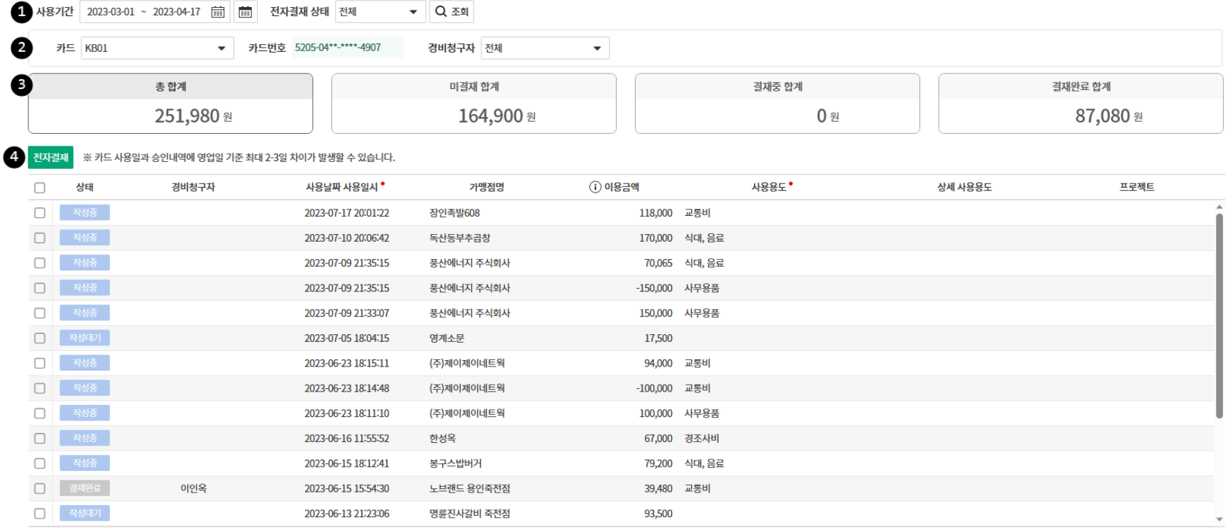 - 검색 조건 : 법인카드 사용 기간과 전자결재 상태로 사용 내역을 조회할 수 있습니다.