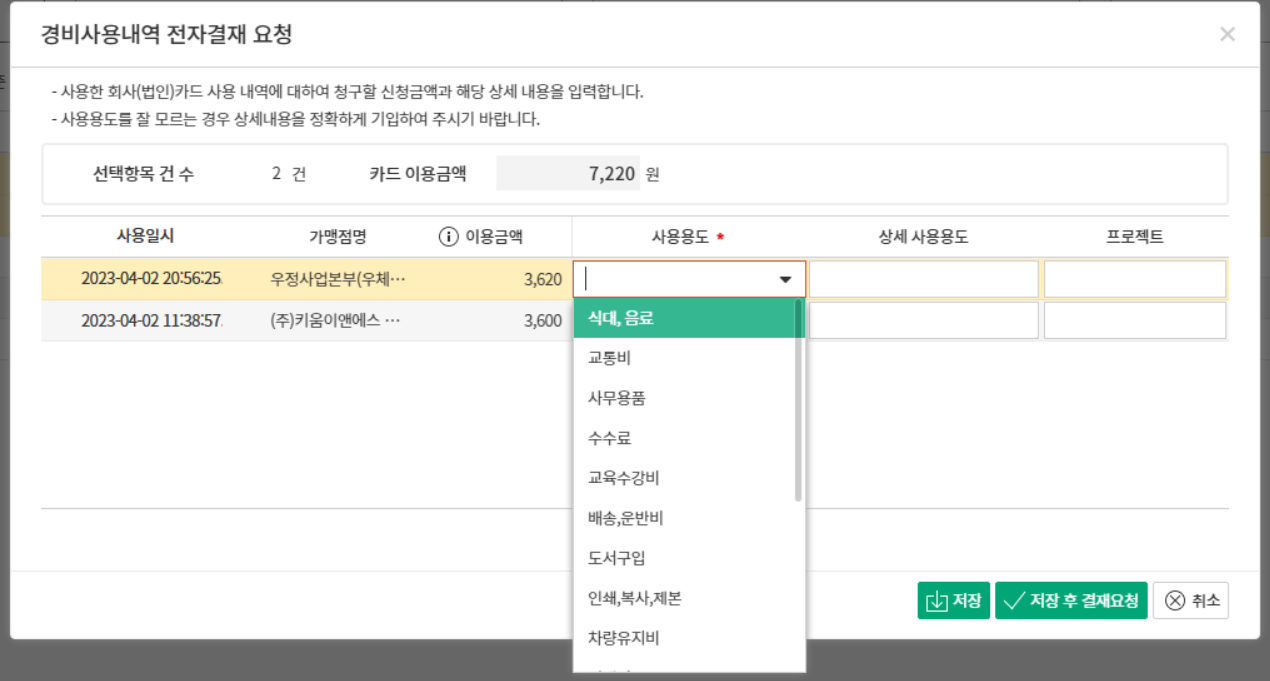 사용용도는 관리자가 지정한 목록에서 선택할 수 있고, 직접 작성할 수도 있습니다.