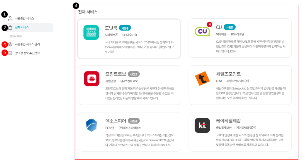- 사용중인 서비스 : 사용자가 현재 사용 가능한 서비스 목록 확인 가능