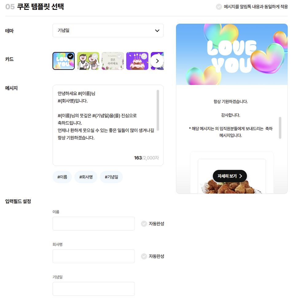 - 테마 : 기념일, 크리스마스, 명절, 이벤트, 서비스 이용 감사, 상품구매 감사 등 쿠폰 상단에 노출되는 카드와 메시지 템플릿 테마 선택