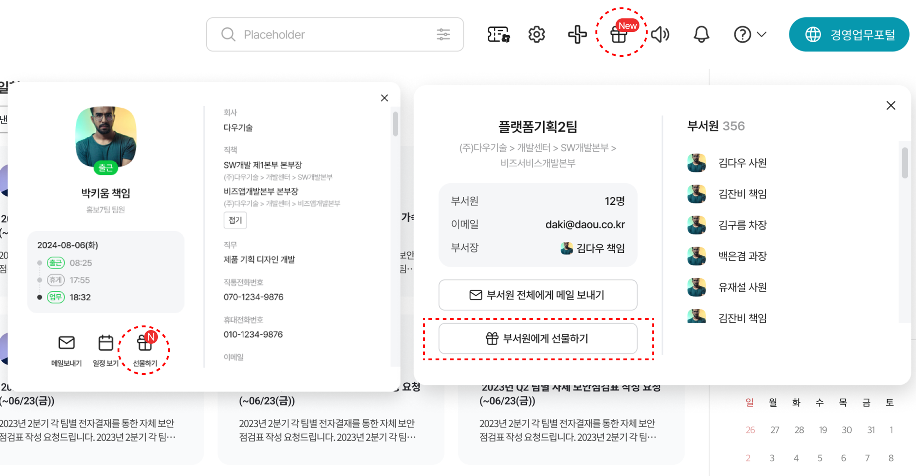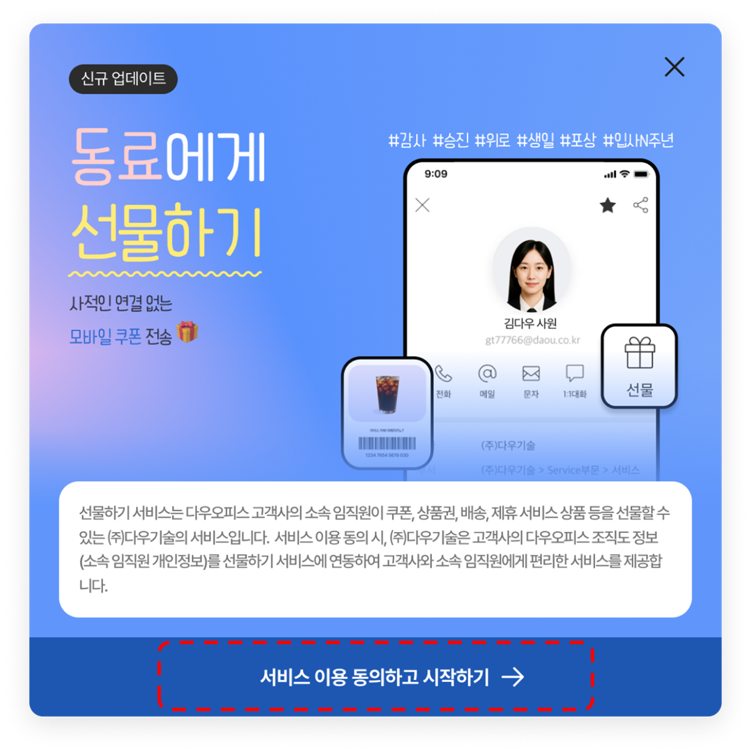 선물하기는 다우오피스 조직도/PC메신저, 모바일 앱을 통해 회사 내부의 동료에게 보낼 수 있는 방법과,