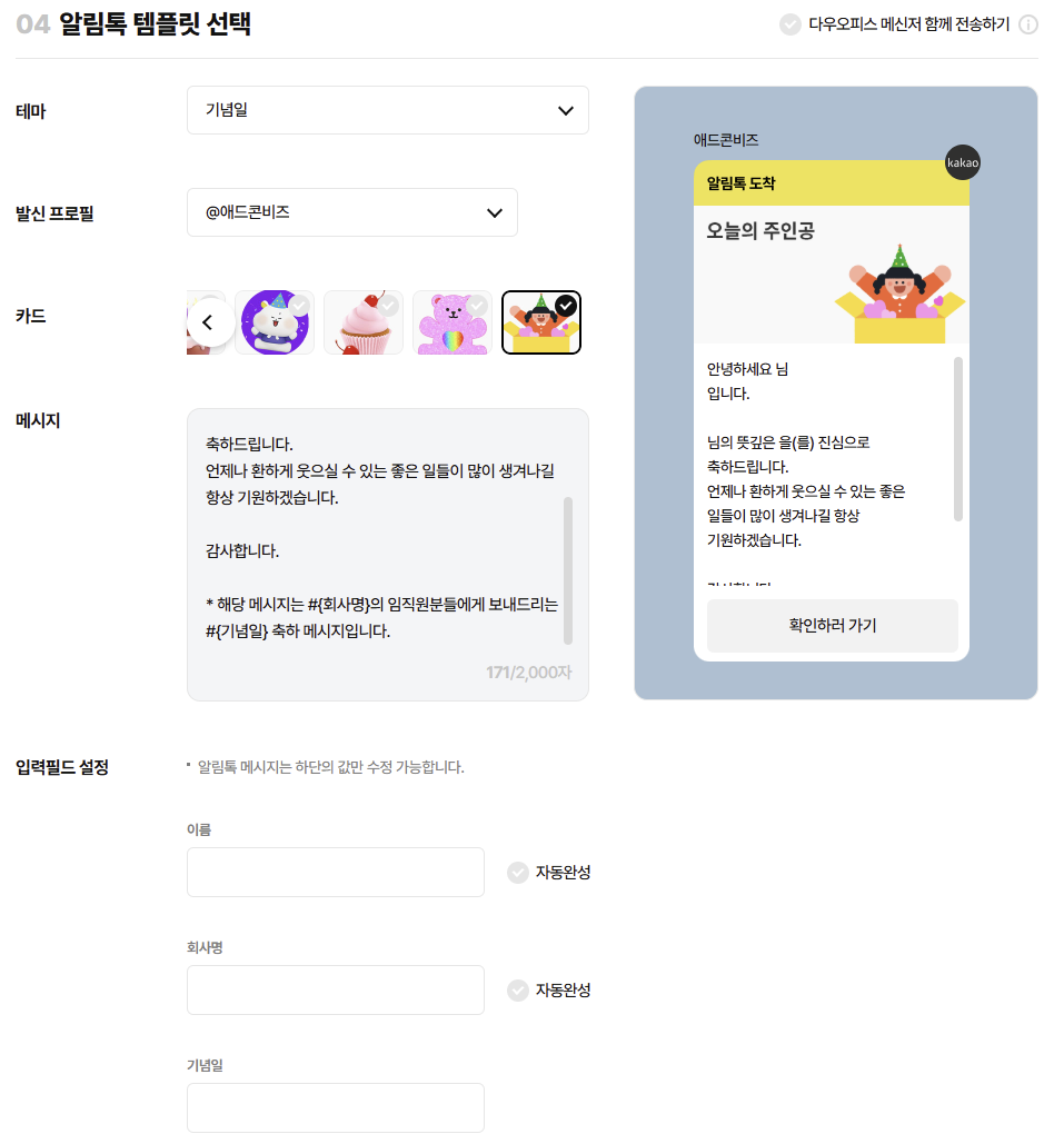 알림톡의 경우, 정해진 템플릿에 이름, 회사명, 기념일 값만 변경하여 발송할 수 있습니다.