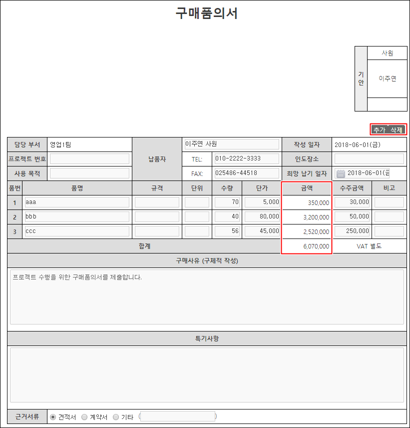 행 추가/삭제 기능이 포함된 스크립트 양식을 활용하시려면 이미지 아래의 HTML과 JS파일을 다운로드 받아 전자결재 양식 관리에 추가하세요.