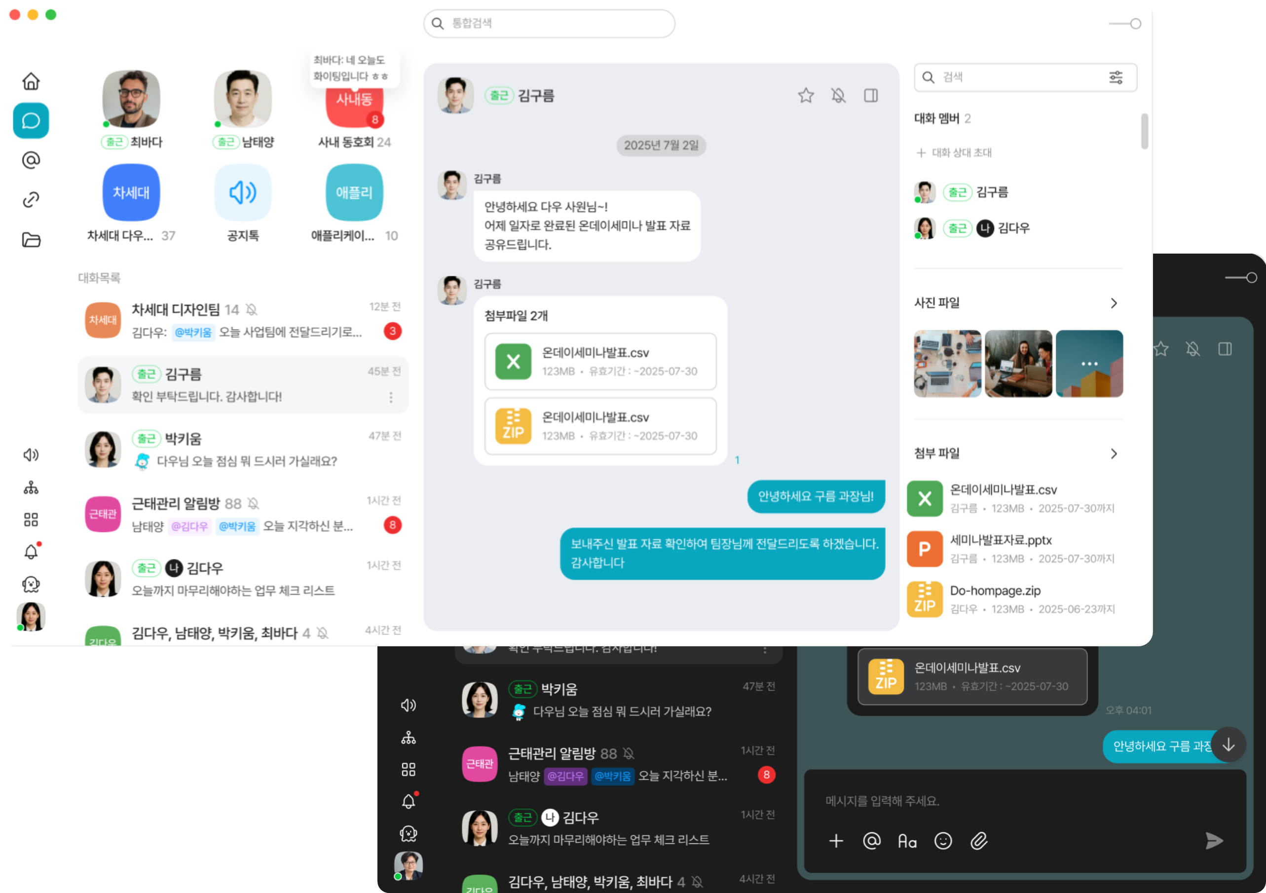 다우오피스 PC 메신저는 조직 내 소통과 협업을 지원하는 커뮤니케이션 도구로, 실시간 채팅, 파일 공유, 알림 확인 등 편리하게 이용할 수 있습니다.